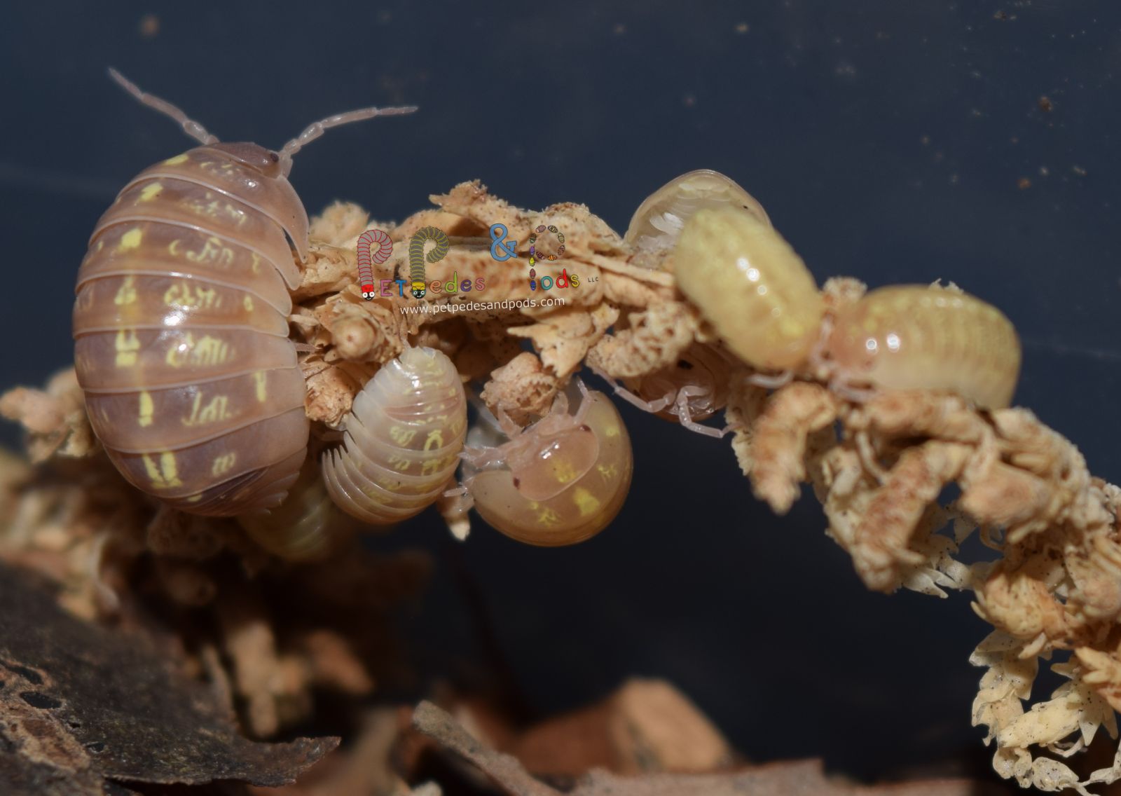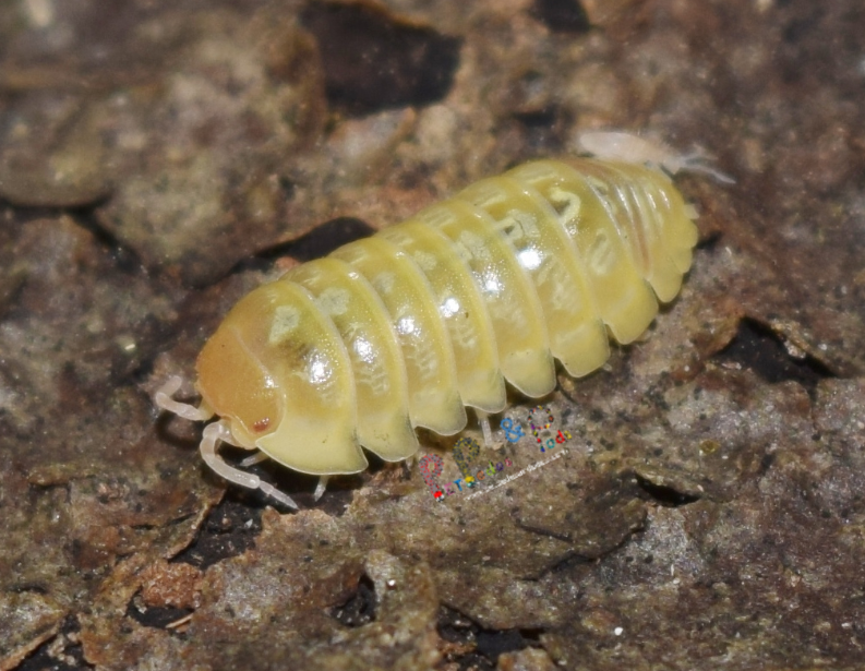“Albino T+” is a mutation of the classic gray Armadillidium vulgare. These are especially interesting because they retain their markings rather than being a solid yellow or white. They reproduce easily once established. This species likes to sometimes wander around on the surface, so I recommend culturing these separately if using in a bioactive setup with primary inhabitants that may snack on them.